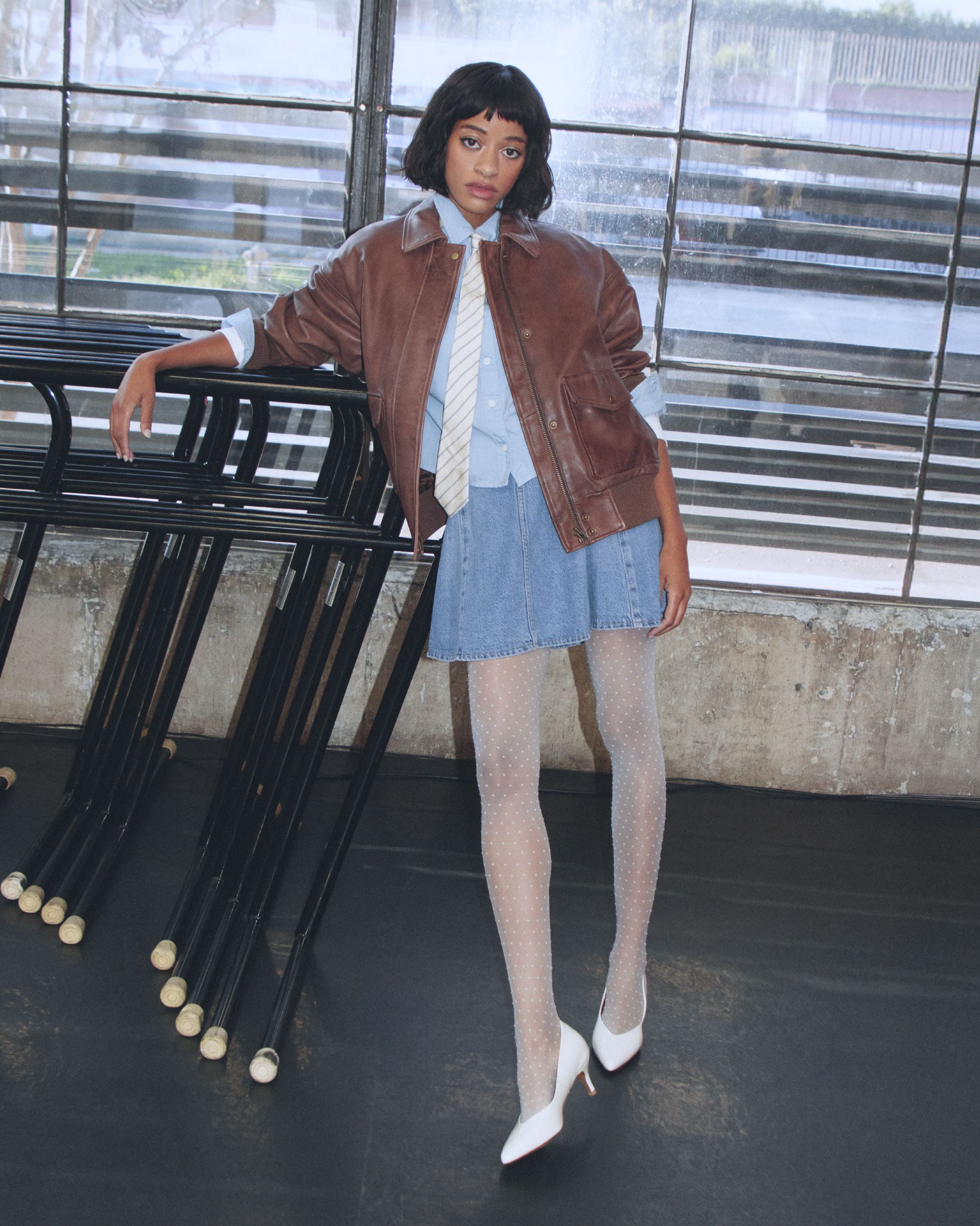 Denim skirt. Boyish bomber. Cropped button-down. A tie between masculine and feminine.