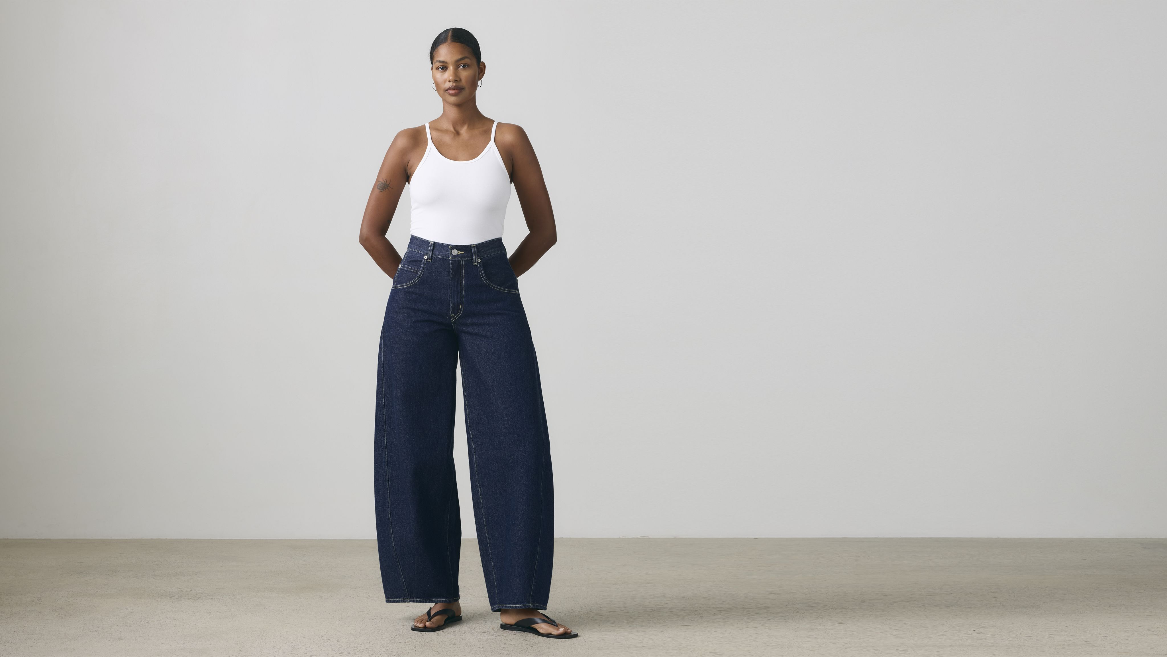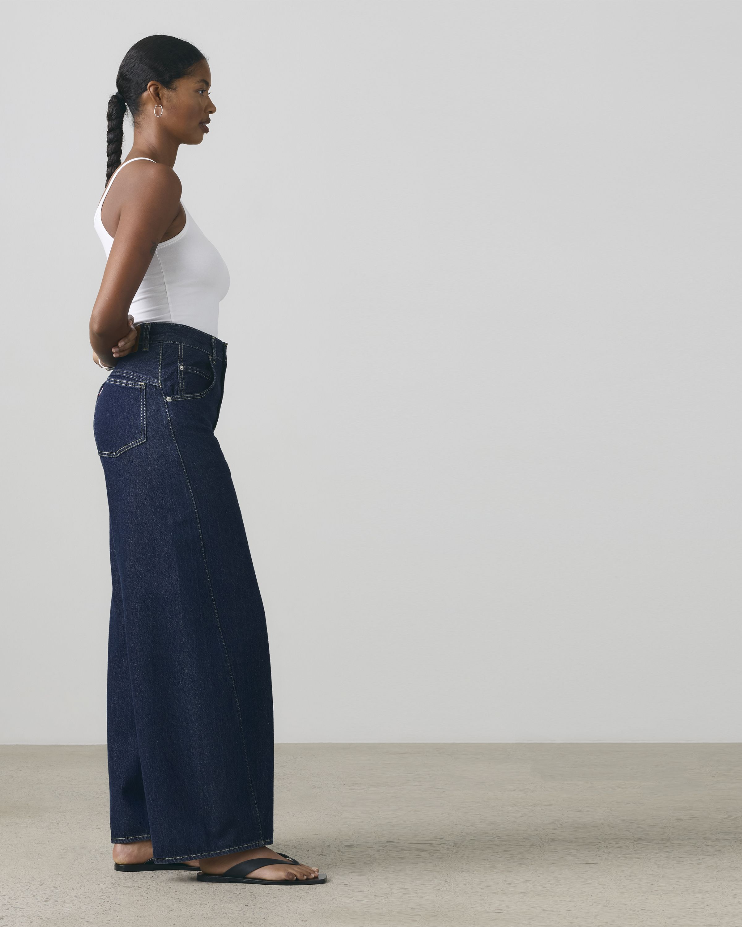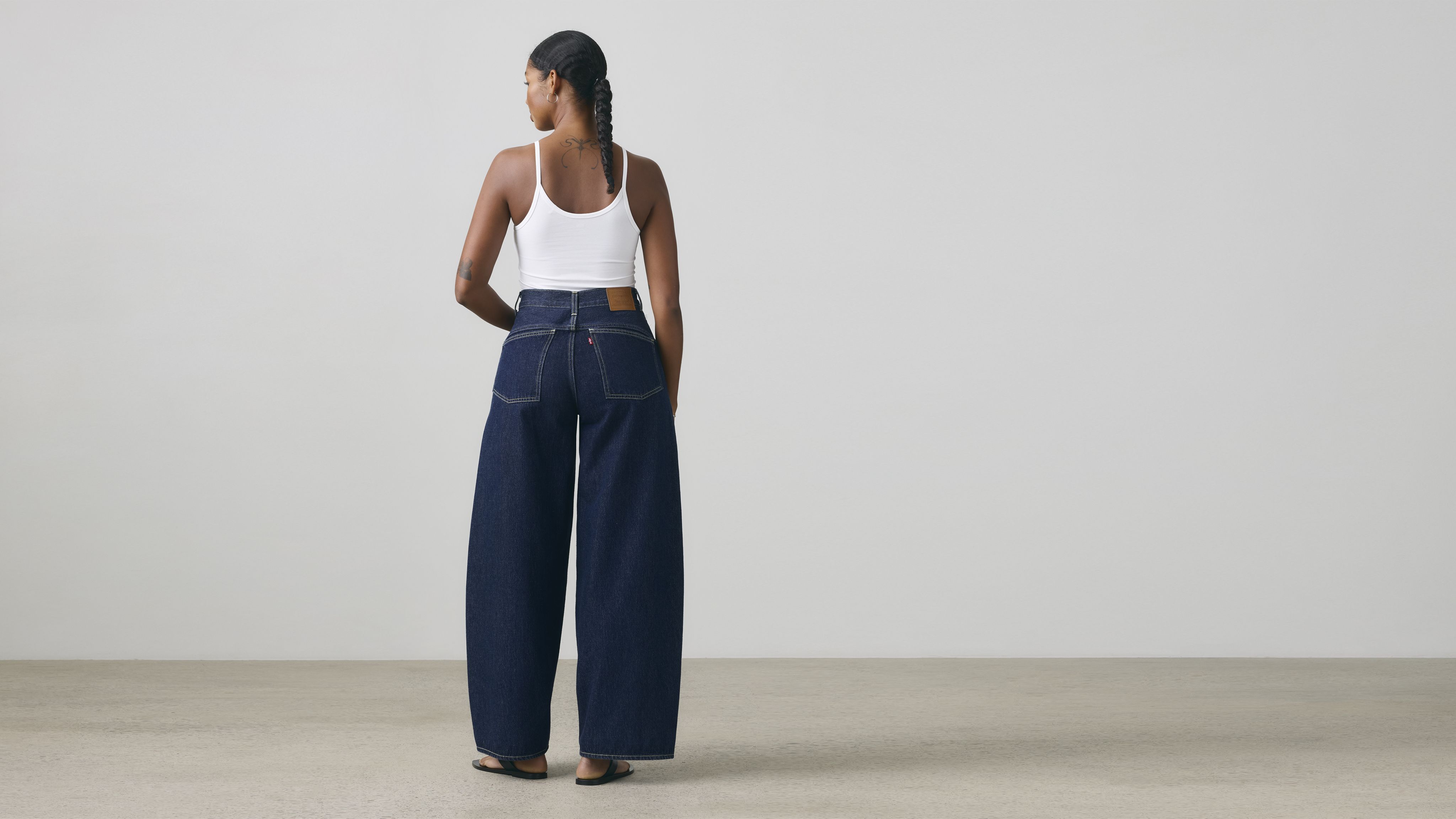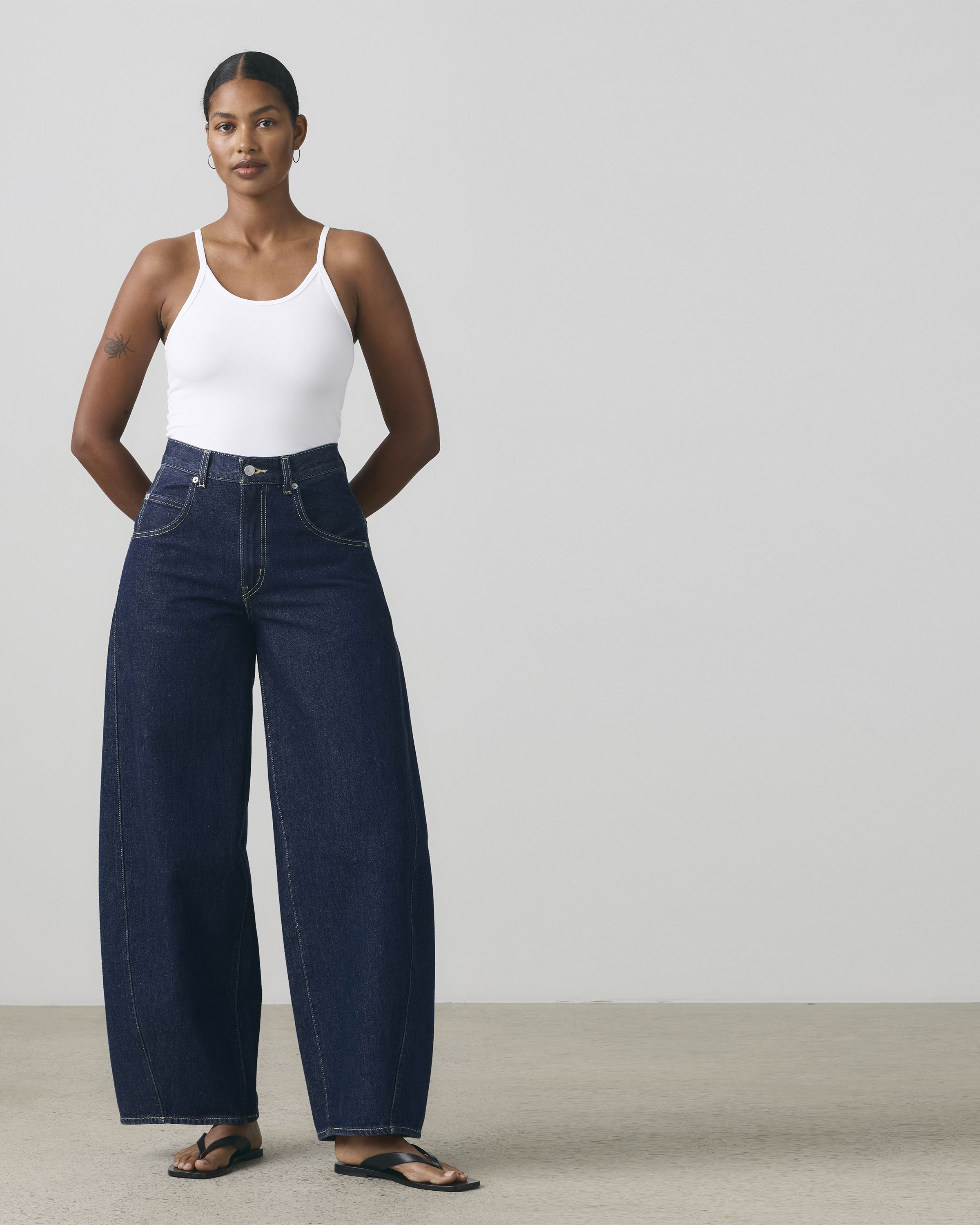 Extra-oversized jeans with a bold curved leg.